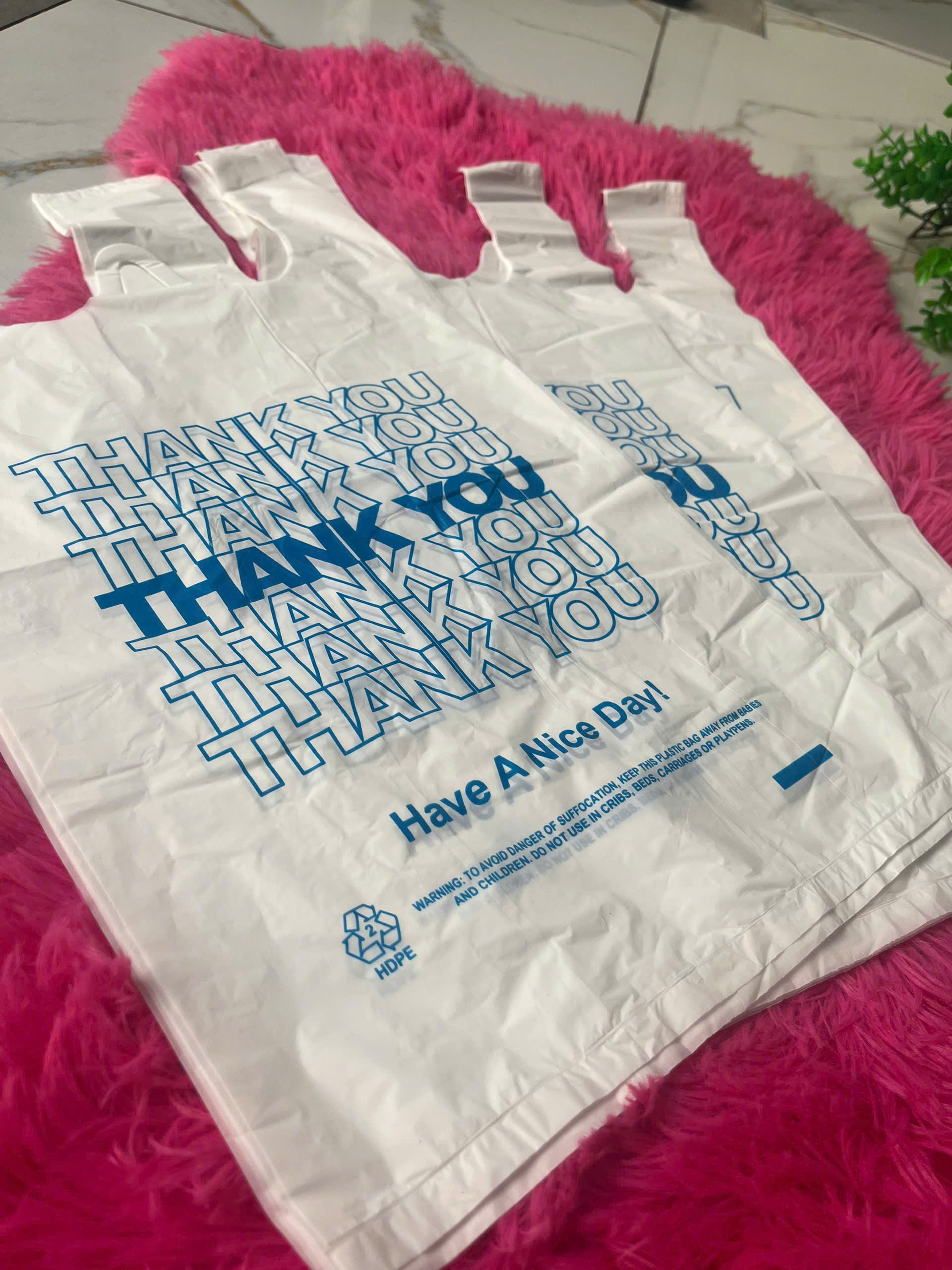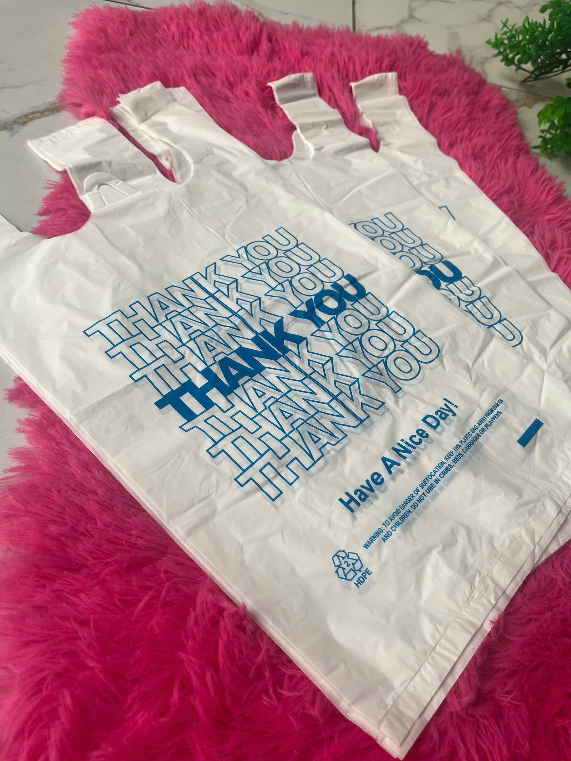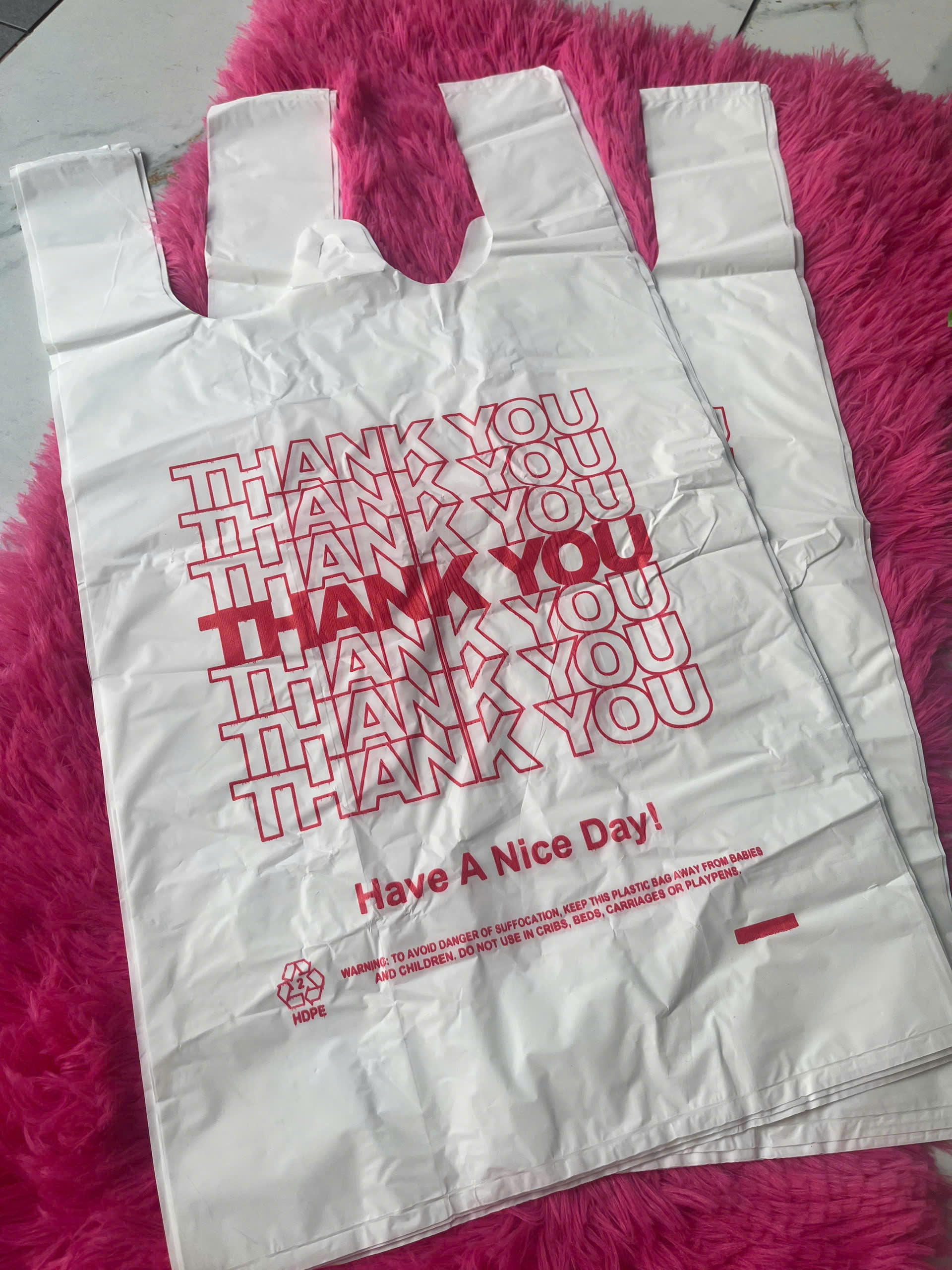 Túi hai quai màu trắng in chữ “Thank You” sang trọng, lịch sự — phù hợp cho cửa hàng, quán ăn, siêu thị hoặc gói quà nhỏ.